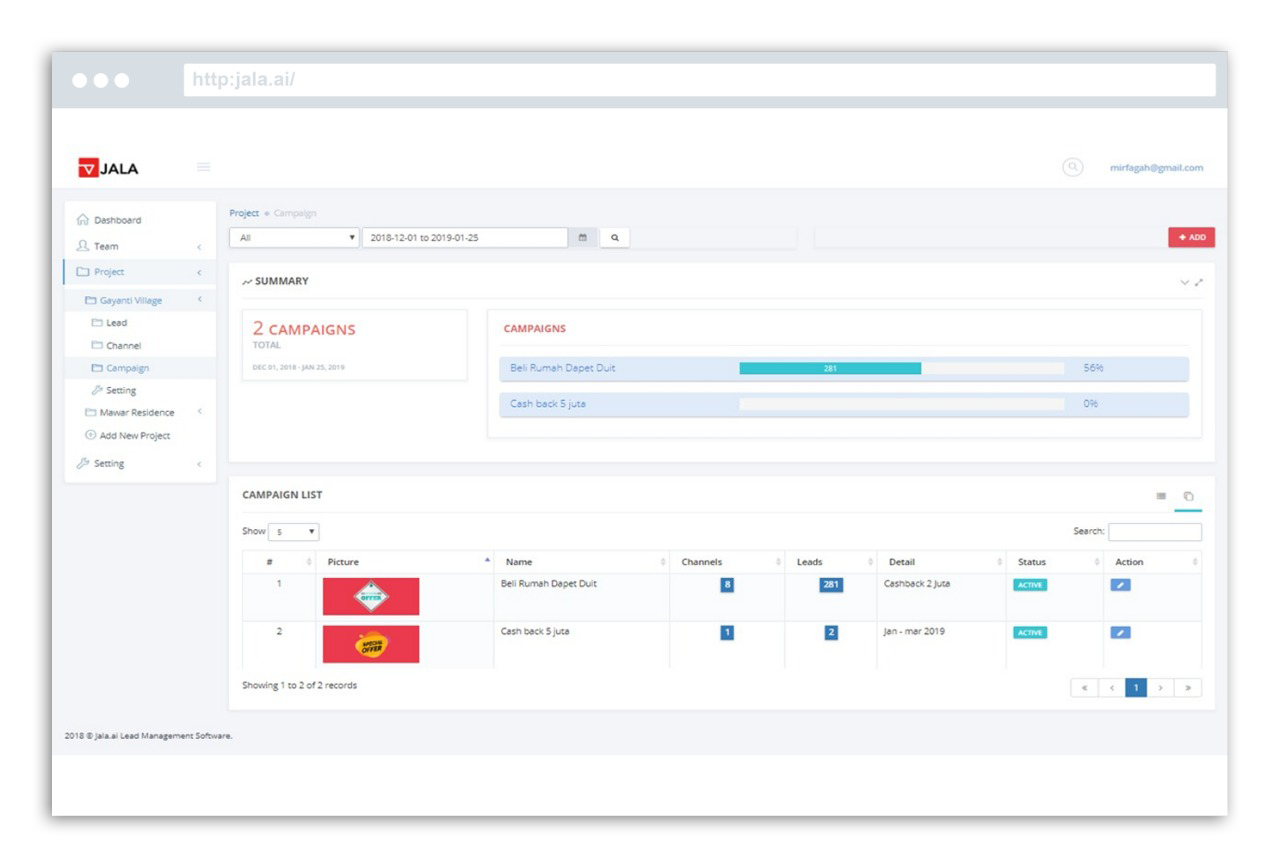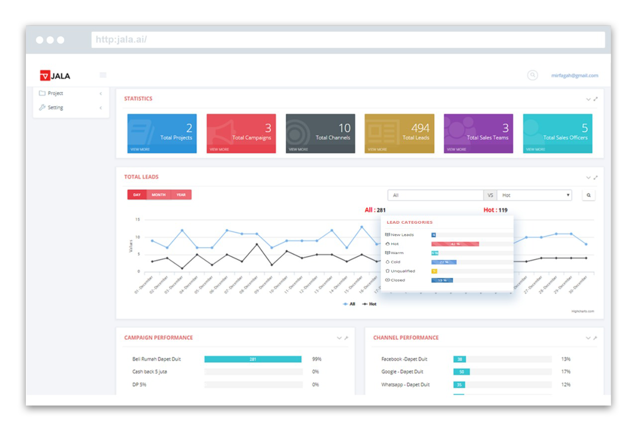 Lead Performance, Campaign Performance, and Team Performance are able to monitored and analyzed on JALA Dashboard.